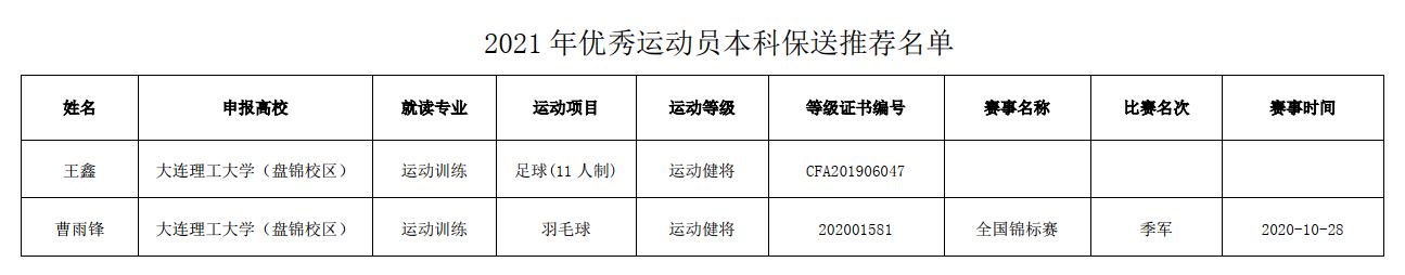 根据教育部、国家体育总局等六部委《关于进一步做好退役运动员就业安置工作的意见》(体人字〔2002〕411号)和体育总局办公厅《关于做好2021年高校保送录取运动员有关事宜的通知》(体科字〔2020〕155号)规定,经大连理工大学、各省区市体育局、体育总局各运动项目管理中心或协会等审核,共有2名报考我校的运动员通过审核,获得保送上大学的推荐资格。审核结果将在体育总局官方网站、中国运动文化教育网和“体教联盟app”上进行公示。